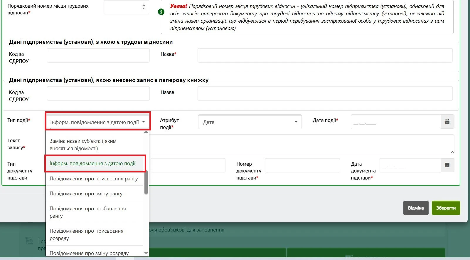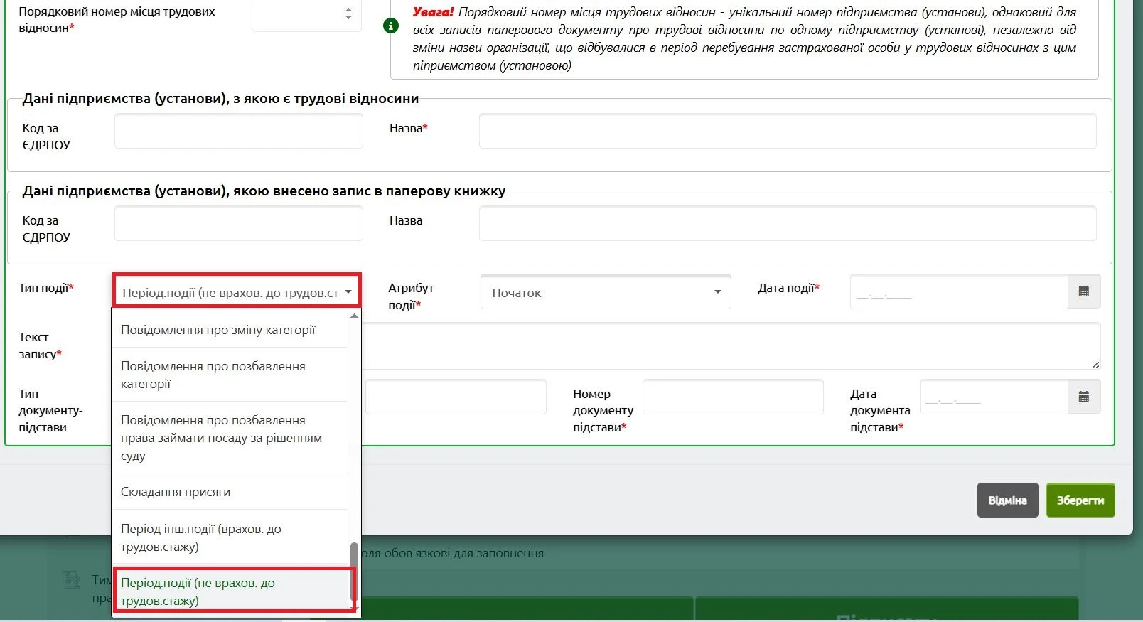 1. «неправильний» запис з позначкою типу події «Інформ. повідомлення з датою події» або «Період.події (не врахов. до трудов. стажу)»;