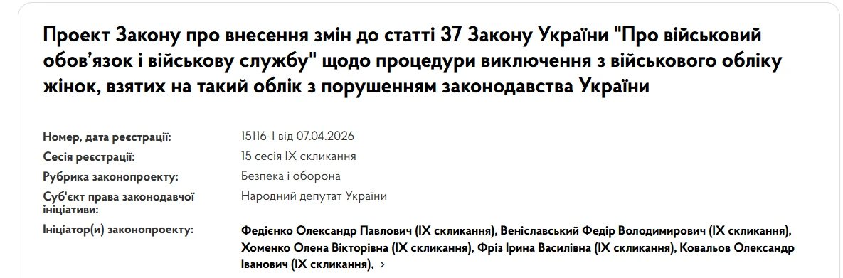 Водночас 07.04.2026 під №15116-1 на сайті ВРУ зареєстровано альтернативний законопроєкт «Про внесення зміни до статті 37 Закону України «Про військовий обов’язок і військову службу» щодо процедури виключення з військового обліку жінок, взятих на такий облік з порушенням законодавства України».