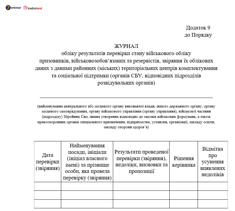 Дуже важливо не плутати цей журнал (далі – Журнал за додатком 9) з журналом обліку перевірок стану військового обліку за додатком 30, який веде і зберігає районні (міський) ТЦК та СП.