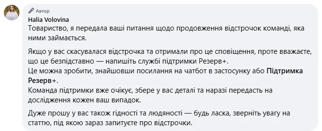 Якщо ж у вас скасувалася відстрочка та отримали про це сповіщення, проте вважаєте, що це безпідставно – напишіть службі підтримки «Резерв+». Про це у коментарях facebook написала співробітниця цифрової команди Міністерства оборони Галина Воловіна.